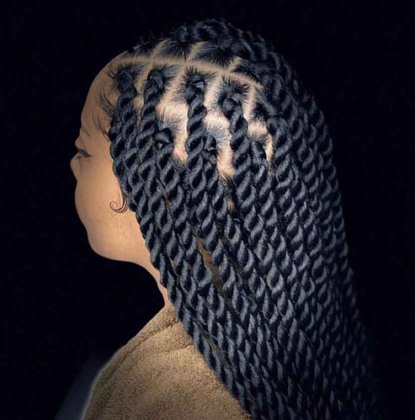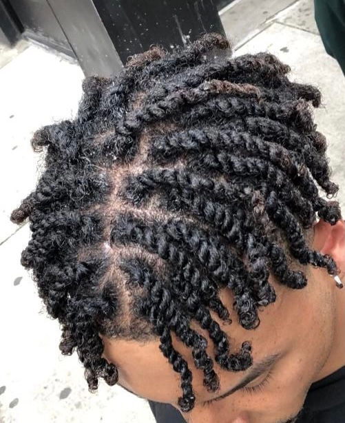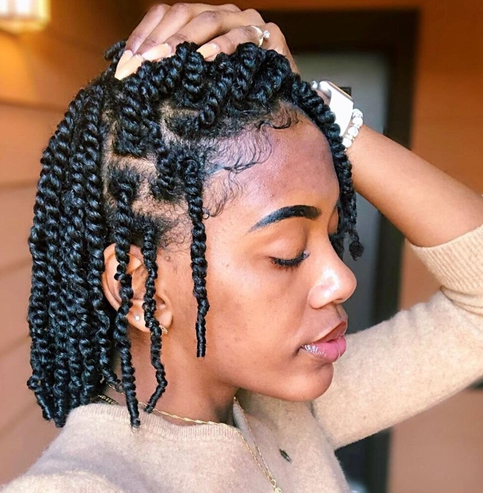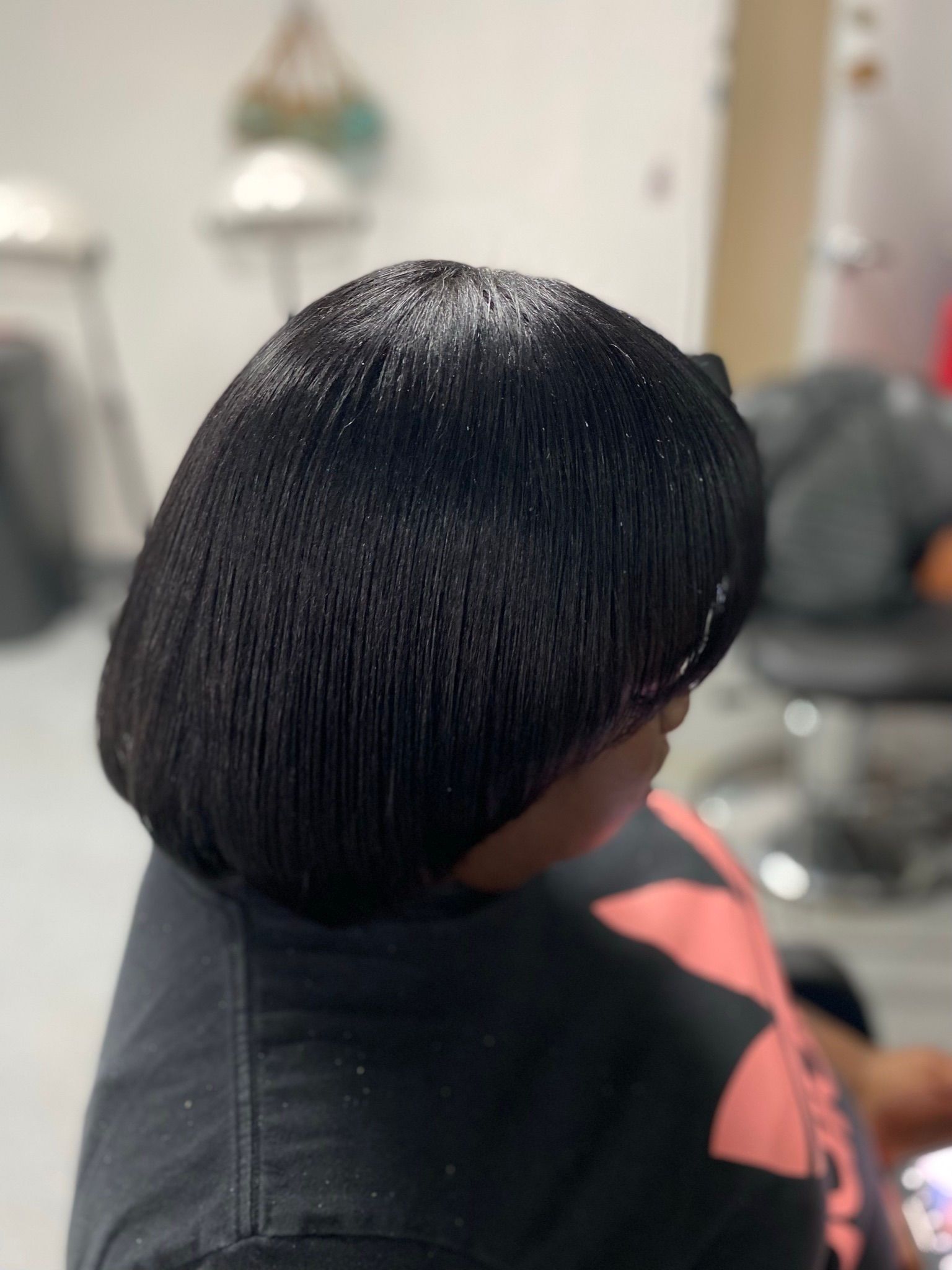 A short layered hairstyle that is typically chopped close at the back and sides of the head.
